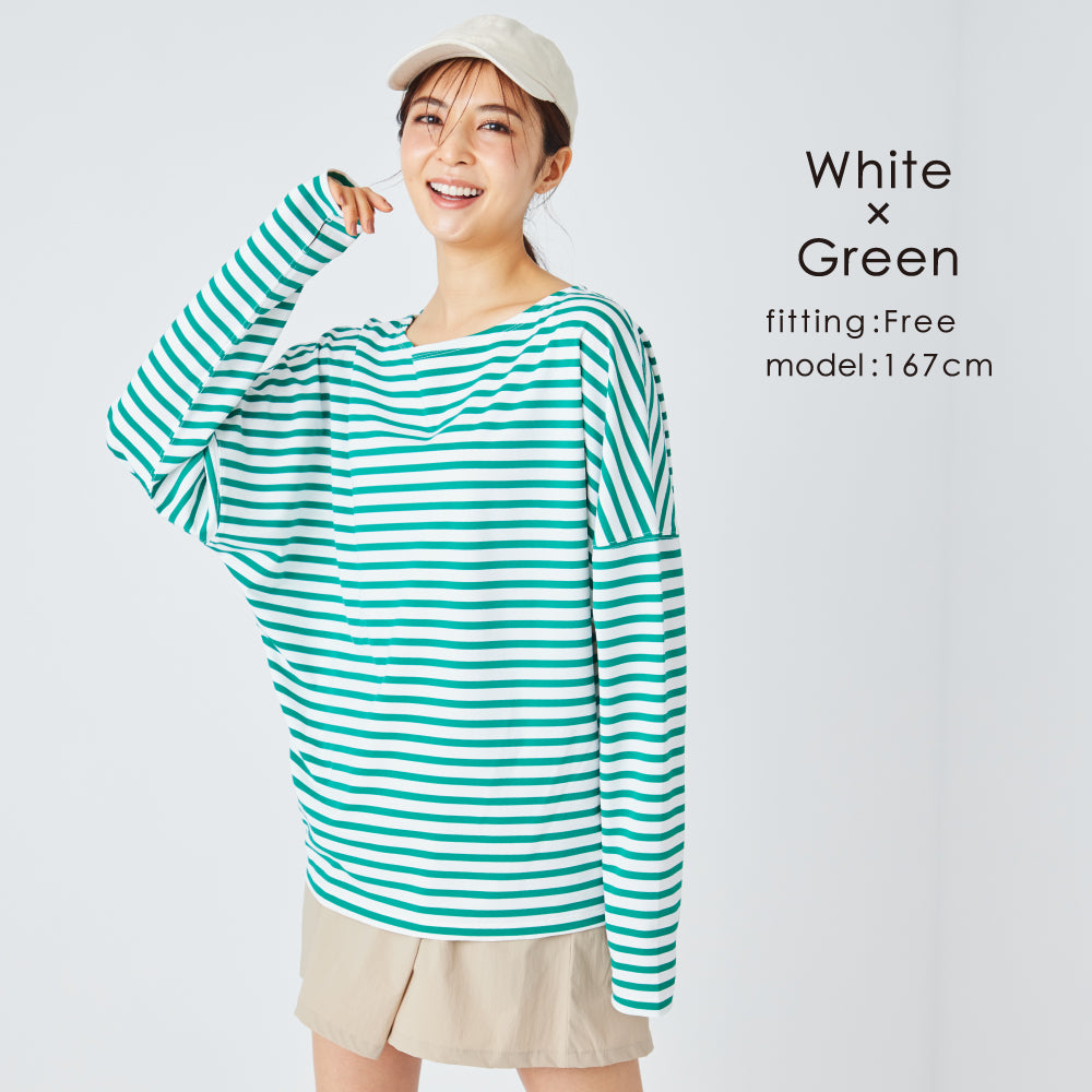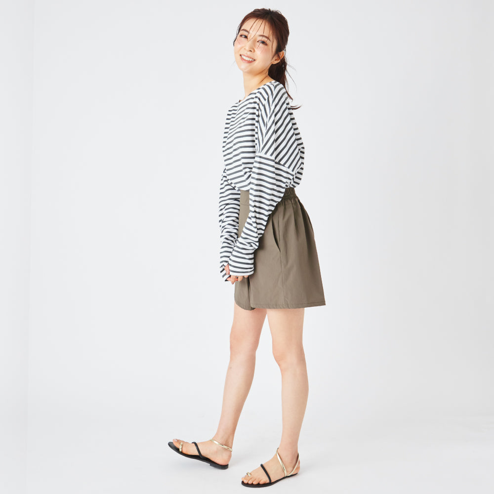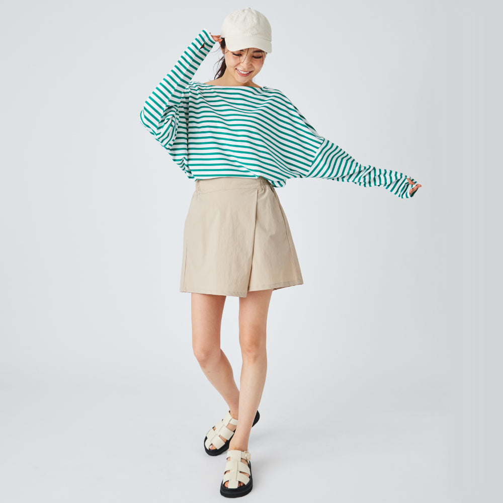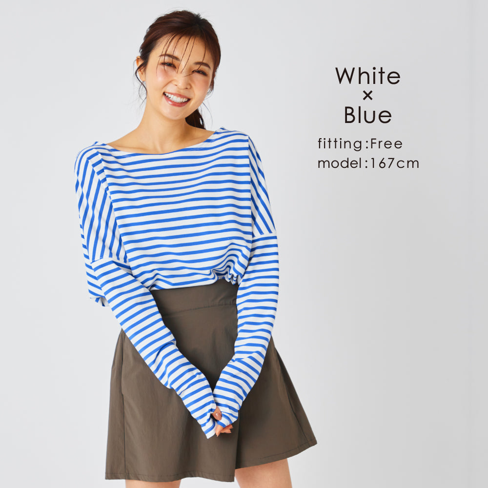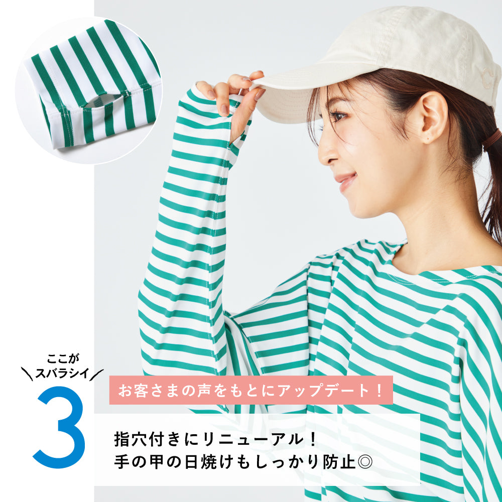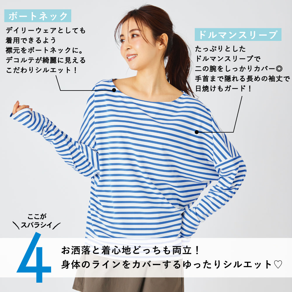 たっぷりとしたドルマンスリーブで二の腕をしっかりカバー。手首まで隠れる長めの袖丈で日焼けもガード。袖は指穴付きで手の甲の日焼けも防止!
