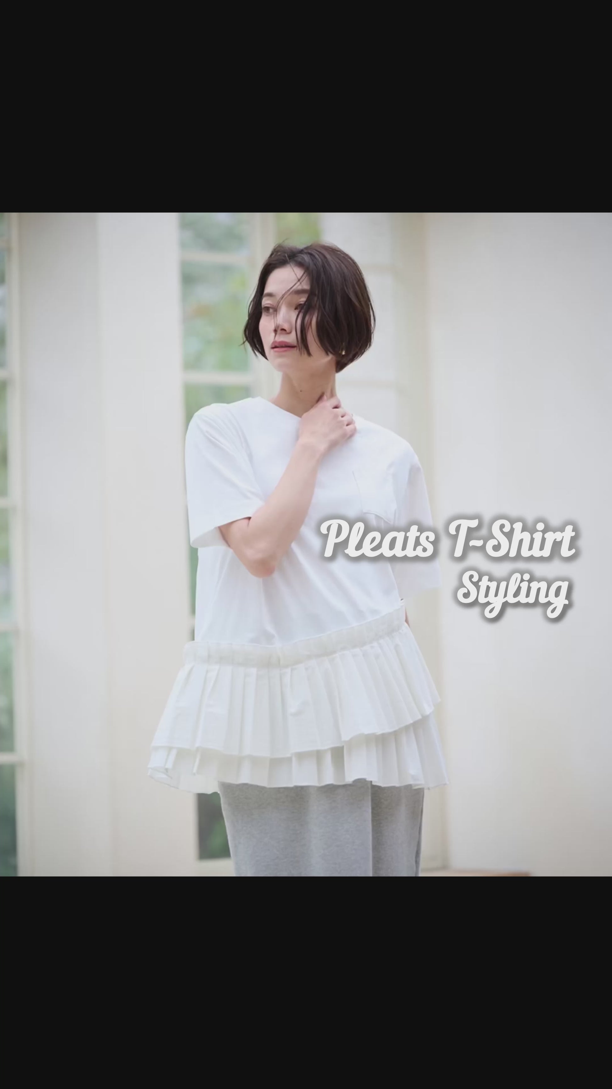 シンプルなTシャツにプリーツをドッキング。ゆるっと着られるのにきれい見えする優秀アイテム。